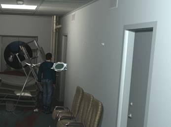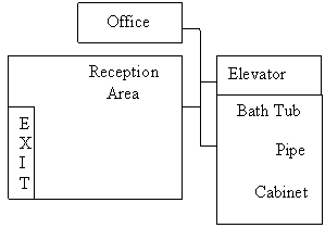 Here is the situation. The Street Exit (see the diagram below) is electronically sealed and the control panel is locked. The key to that lock is in a cabinet in the Bathroom, but this cabinet is also sealed -- by a code lock. The code is inscribed on the hand of a body in a bathtub on the other side of the bathroom. But you cannot reach this body because a pipe has burst, spewing out hot water, thus blocking your passage. The water valve is in the Reception Area but is blocked by the bulky body of a man whose head is caught in the Office window. So this is what you need to do, to finally get out of the hospital.