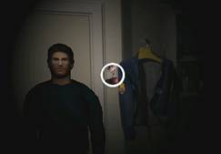 Approach the Workshop and open the door (with the key that appears to have a tag with number 1 on it) to enter. There is a light grey jacket hanging in the large closet on the hero's left. Use the Action icon at the cuff of the jacket to remove a flashlight. Now move towards the work table on the opposite side of the room. Use the Action icon to remove the cloth from the safe under that table. Now open your inventory and use the Action icon on the pen to turn it into some kind of a key. Use this "key" on the safe to open it. Look inside the safe. Pick up the piece of paper (right in front of you, but to the left of the bottles), look at it in the inventory, and make note of the code: BYRGR.