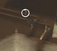Next, open the inventory and use the Action icon on the wire you just removed from under the mattress. It will turn in the shape of a hook. Pick up the hook and use the Action icon on the thread, to combine the two in the inventory. You now have a fishing hook of sorts. Now turn around and close up on the faucets. Use the Pick up icon to remove the knob from the right faucet. Place this knob on the left of the two pipes by the commode, and use the Action key on the knob to turn off the water running in the commode as well as from the right tap. Now pick up the knob and place it on the right pipe, and then use the Action icon to turn off the water in the left tap as well. Use the Action icon to turn the left faucet upside down. (See picture below) Now use your threaded hook to "fish" out the card hidden inside that inverted faucet. (This is your third hidden card.)