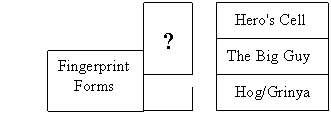 Step out of the close up of the computer. You will see that one of the large drawers to your right is now open. Pick up a cartridge from it. Open the inventory now and use the Action icon, first to bring out the phone and then to dial 24343, to call Stupor again. Tell him that you found the cartridge. He won't believe you, and ask you to describe it. Tell him that it is orange with a yellow stripe. Stupor will then tell you that you would have to make your own way out, but will also explain just how to do so. Follow his instructions and go back out to the Cell Corridor and approach the left door against the wall (the one marked with a "?" in the earlier diagram). Use the Action icon on that door and the hero will automatically knock the way Stupor had described. The watchman will let you in, and you will find yourself in a room with apparently no other door.