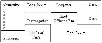 Return to the Pool Room and turn to your right, this time. You will enter a room with two desks in front of you, and two doors on your left. Use the magnetic strip card on the card-reader to the right of the first of these two doors. Enter to find yourself in the room where the chief officer had interrogated the hero earlier. Use the Action icon to open the safe on your right, and feel free to look at each of the five folders inside. These are police reports on the prisoners, including the hero. Step out of this close up and into the one on the left side of the desk. You will see an ink pad sitting at the upper right hand corner of the desk. Use the Action icon on it and the fingerprint form in your inventory will automatically appear on the upper right hand corner of the screen, showing that the hero's fingerprints have been taken. You are done in this room also, so return to Maslova's office and turn left of the Interrogation Room this time (through the door with the light coming out).