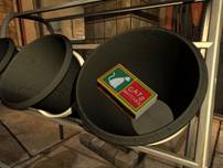 Take four more steps and turn left to see the words "No Entry" marked on the ground. Move forward three steps and come to where three black buckets are placed in a stand. Close up on the black bucket closest to you and click on the box of matches inside to deposit it in your inventory.