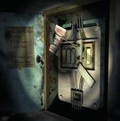 Turn left and close up on the table, to find four videocassette-players stacked on top of each other on the right and a monitor screen on the left. Click on the players, one by one and starting from the one at the top working your way down. Each time you click on a player, you will be directed to the screen for a short clip of what happened, at least from Ben's point of view. After you have watched all four of the clips, step out of the close up and turn right. Step forward now and turn left. Close up on the door handle, and click on the little knob under the handle, to unlock the door. [You will now be able to go in and out of the office through this door, without having to come through the broken wall.] Turn right, and approach the desk in front of you.
