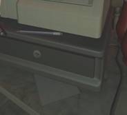 Step out of the kitchen now and turn left to face the cash register (on the counter in the café's serving area). Close up on the register, and click on the trowel in your inventory, to see it applied on the register drawer to pry it open. You will automatically be given a close up of the contents of that drawer, and find some loose change as well as some bills. Click on the coins twice, first to bring some of them into view and then to deposit them in your inventory.