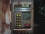 Click on the hand icon appearing outside the PDR, to put it back in your inventory. Turn left now; step forward and to your left again, to face the door of Room Number 3. Close up on the panel above the doorknob and click in the code: 327, to unlock the door. Enter the room.