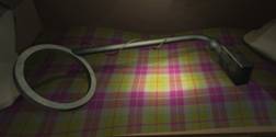 Turn right, take two steps forward, and then step through the door to return to Ben's office. Step outside the service station now, through the Lobby, and go to the Motel across the street. Approach Room Number 1, close up on the code panel and click in 673 (the code you had gotten earlier from the filing cabinet in Ben's office). Step inside, and take a step forward. Turn around now, to see the entrance door across the room, to your right, and just a small portion of an inner wall sticking out in your view, from the left. There is a charger attached to the right of this dividing wall in the middle of the room. Close up on this charger, and find a GPS unit placed in it. (See the picture on the next page.) Click on the GPS unit, to bring it in view; and then click on it again, to deposit it in the top right portion of your screen.