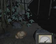 We are done here in the Winnebago, so step outside now. Step up on the plank now and take five steps forward. Turn right then, and take four steps forward, reaching the end of that plank. Turn left and take two steps forward. Turn right now, to find the ruins before you. Click on the metal detector, to bring it out in view. Click on it, and it will settle in the lower right-hand corner of the screen, with the needle dial showing. Take two steps forward, and you will "feel" as if you have just climbed over something. Take one more step forward, approaching a large black hole in the wall in front of you. The metal detector will start to hum, the needle will start swinging, and a green light will start to blink on the dial's upper right-hand corner. Close up, to find three large leaves on the ground. Click on them, to remove them; and then, click on the trowel in your inventory, to reveal a broken piece of metal under the dirt. Click on the metal twice, first to bring it in view and then to deposit it in the inventory. [Note: This is the first of the three pieces of the Artifact you will eventually need.] Click on the piece of paper that was under the Artifact piece, read it, and then put it away.