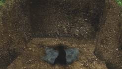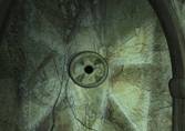 Pick up the Artifact, step out of the close up, and take a step forward. Turn right now, and take nine steps forward, to find yourself back by the tent. Turn left then, and take six steps, to return to the Stone Circle. Turn right now, and take three steps. Turn left then, and close up on the open trench in the center of the Stone Circle. Click on the trowel in your inventory, to see some of the dirt removed to reveal the image of the Artifact underneath.