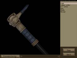 Talk to the owner. Jim will then buy the cane. Examine the cane in inventory. Note the vertical lines just under the head of the cane and the Rune Symbols going down the handle a little ways. From the vertical lines down, match up the Rune Symbols, just like you did back at the underground caverns at the Monastery. When the cane opens, you will get a Treasure Map.