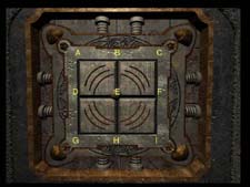When you reach the shaft way, click forward once, then make a right and keep going right until you reach the alcove, make a right into the alcove. You will see some skulls and vases on an altar, turn slightly to the right and click down low, click on the big box and get the artifact from inside. You can examine it in inventory to see the markings on the back of it. Exit the alcove--you will automatically go to the left, but turn around 180 degrees, and click forward and keep going right. You will end up at a Sarcophagus, notice the hasp on the front and it's markings, use the artifact you just acquired on the sarcophagus, When the lids opens notice the Rune Symbols reflected in the top of the lid, click on then and Jim will make note of them. Exit this room. Then click forward but keep on branching to the right. You will end up in the main Pillar Room. Turn yourself so that you are facing the altar, then turning to your right, go through the 6th (sixth) door. Go forward and keep making rights again. Then you come to the open area where there is a Bridge and Steps. Click Forward Twice. An arrow will hit Jim's torch. Then click on the steps in the following order, left step, right step, left step, center step, right step, left step, & then right step. At the top. Click on the sarcophagus, then click on the broken lid. Then click on the Rune Symbols, and Jim will make a note. Then inside the sarcophagus, notice the skull is missing. Then click forward and go down the steps in the opposite order of when you came up. Like so....Left, right, left, center, right, left and then right. Then go back down the passageway and keep going right, You will end up at another sarcophagus. Click on the sarcophagus once to bring into a close up view, and then click on the lid to bring up the Puzzle. The object is to move the blocks around to free up the four corner stones that are tucked into the outside edges. There's no exact way to solve it. Just remember this---you have to put every block inside the frame. To simplify your quest, use the corner hole to put the small square block for a while. Put all the vertical blocks in the middle. Arrange the rest and finally take out those small square blocks again. Look at this final picture to help you (it's only one of the many possible solutions).