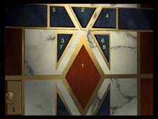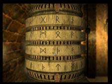 Now exit here and using the blueprints, go to the four compartment car from the front of the train. Enter room #7. Turn to the dresser and click on the top drawer, open it. There is a piece of paper with a single Rune Symbols on it, click on this. As soon as you do, Jim will get dizzy and pass out. You wake up to a Blonde Woman in the room. After this, go back to the Conductor's Office and talk to him, Ask about Collins, He is gone, but luggage is not. You go to the baggage compartment. Go to the end where you found the blueprints, but turn right anc click on the clipboard. In close up you notice that Matt Collins' tag number is 0100AA. Turn around and head to the opposite end, all the way to the door.*****SAVE YOUR GAME ***** there has been report of a "bug" here. Then turn back around 180 degrees, and click on the crate on your right, this is the crate you are looking for. First remove the small pin from the top and put it in the small hole on the left in the front. Then remove the large pin from the top and put it in the other hole on the front. Then flip the top hasp down, and open the lid.--You will notice it is a couple of cases of Champagne. Close this back up, and flip the hasp back into place.