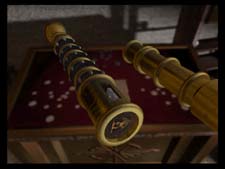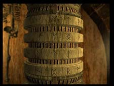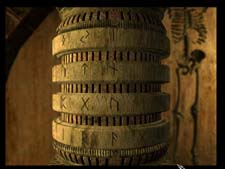 Then use the assembled Rune Stone Shape on the figures cupped hands. Watch the video sequence. Afterwards click on the figure again and notice its eyes are glowing red. Back out of this view and tilt your view down and to the left. Now you can go down into the trench around the sarcophagus. Go down inside towards the head and turn to see some binoculars, look into them. You will see a red fog. Notice the panel to the left of the binoculars--click on it until you get a great stone face and then click once more past this. Then go around to the foot of the sarcophagus and you will see 2 more panels, Do the same to them. Then go back to the head and look into the binoculars again, now you see a panel with a "Red Dot" in the center. Back out of this view and turn left and move the cursor along the inner wall of the trench until the cursor turn into a pointing arrow, click on this and Jim will remove a dagger from the wall and another secret passage opens.
