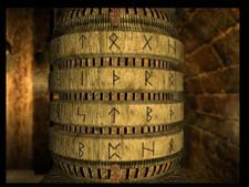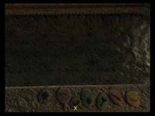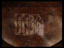 When the sarcophagus opens up and you get a view of the skeleton inside and the sword on his chest, click on the symbols and Jim will make a note. Exit this chamber. Click forward and keep branching to your right again. When you enter this next chamber, turn to your left and click on the sarcophagus to get a close up, click on the opening to get a view inside. Then click on the little square stone pieces you see scattered about in front of the skeleton. Now turn to your right and you will see a basin of water, hanging from the figure on the wall. Click on it to get a close up. In you inventory, use the stone pieces on the basin of water. Then arrange the stone pieces inside the basin to form Rune Symbols that look like.. A vertical line, a slanted letter X, what looks like a small letter N ( n ), and a letter F with the tines slanting down. Note each Rune Symbol will have 3 pieces of stone, and then the stones will be put together to form one large square. Click and drag the pieces around to arrange them.