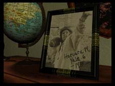 Turn around and click on the maid's cart, click on the cart again and get a view of the middle shelf, click on the knife that is under the napkin and take it to your inventory. Now click on the transom above the door. Jim will use the knife to get into the room. Inside, turn to your right and click over towards the bed, then click on the vase beside the bed, in close up view, click on the key inside the vase, then click on the piece of paper and this triggers a video sequence--After this, go back to the vase and get the photograph that is now been placed there. Examine it in inventory be sure to click on it and view the backside of it. Now access your World Map and go to Sullivan's Office.