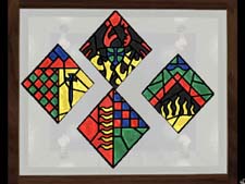 After Helen puts the book away, talk to her and ask her about the Stained Glass Window. Click on the stain glass pieces to bring up the puzzle. One crest is almost completed for you, all you need to do is put the other three together. It does not matter in which order you do this. Clicking and dragging the piece, you will bump into other pieces, click and release the piece becomes the cursor. One way to check your progress is to look for the embedded words in the stained glass by using the red filtering light that is above you and on the left of the table. Don't worry about backing out of the puzzle-as it does not reset. What you are looking for is four names that are seen in the red filter of the four stained glass shields--make a note of these, and to which shield they belong when you have completed the puzzle.