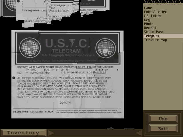 After the initial video sequence (of which there are a lot-so I will just state video when they come up)--you wind up in your office. Click forward once and head behind your desk. Tilt your view down and to the left and click open your center desk drawer--read the newspaper article and then click on the little green book and read the Preliminary Report. Then move over and open the right hand desk drawer, read the "to do" list that is inside, and take note of the items not yet checked. Put the list back in the drawer and click and slide it back until the revolver is seen, click on the gun and put it into your inventory. Now turn to your right and face the file cabinet. Tilt your view up slightly, and click on the little black book on the top of the stack, Read the Fifth Column Lessons for America. Then click on the top drawer of the file cabinet and read the information inside, Jim (your character) will automatically note the gibberish inside. Now lets examine what we have in our inventory--click on badge-note on the left hand side is a piece of metal sticking out, click on it--it's your St. Christopher Medal. Now click on your case file and click on and take a note of the different parts of it, remember that you can slide the pages up & down and click for next pages. Now click on the Revolver--putting your cursor on the butt of the gun you notice it changes, you can click here. Click-hold and drag it towards the barrel of the gun. This reveals a key, take the key. Exit your inventory. Click forward -turn to face the bookshelves on your right and notice at the end there is a locked cabinet. Get a close up of this and then access your inventory and use the key on the cabinet. Click on the message left by Dr. Strauss, then click on the notes at the bottom--Study this carefully, as it a major clue--the numbers and letters refer to a phone dial. Notice the scribbles that say 0 +1 - 1 and then the + or - and the ?, next Click on your office door and go to Sullivan's office.