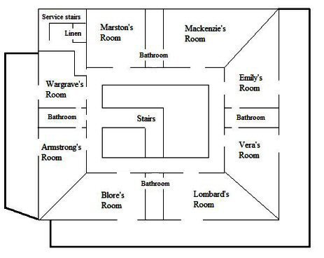 Vera Claythorne's room - Talk to Vera. Emily Brent's room - Talk to Emily Brent. General Mackenzie's room - Talk to the General. Go downstairs to the game room.
