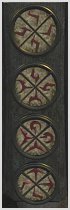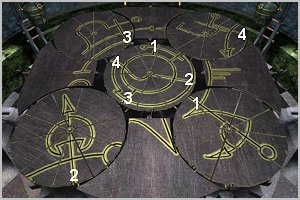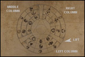 The array of symbols are identical to those on the three columns on the first level. Adjust the positions of the symbols to correspond with the drawing in your Journal. Note that the positions of the symbols on the diagram must be viewed from the centre outwards. In other words, the 'left' symbols (left column) in the diagram are actually the 'right' symbols when viewed from the centre. It may help to note that the middle symbol is always the one that cannot be seen on the actual column.