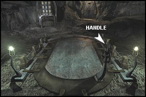 Go back through the large round door and along the walkway to the tunnel. Although the machine with the metal platform is presently not functioning, examine it so that you recognize it in a later cut scene. While standing on the metal platform, pull the lever at the bottom (on your left) to get to the top of the machine. Take note of the four gold squares in the centre.