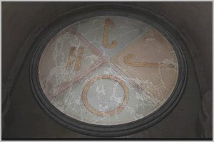 There are four columns, comprising four circles, inside the barrel-shaped object. Turn the large wheel at the top (either left or right) to rotate to an adjoining column. The circles each have four symbols on them. Other than the top circle on the first column, the circles can all be rotated. Note that the symbols on the circles are identical to those making up the four drawings on the wall. The symbols are therefore divided into four pairs of two symbols each.