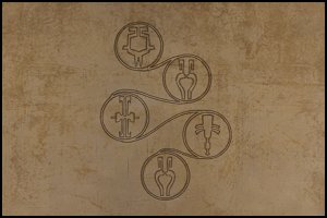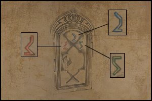 During the cut scene after solving the mirror puzzle you again see the lever in front of the statue. By now you should know the drill - pull the lever twice to reveal another secret passage below the statue. At the end of the passage there's another ladder. Before climbing the ladder, study the walls very carefully and make a note of the four drawings. Each drawing consists of two interlocking symbols.