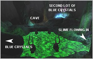 | You need to familiarize yourself with the surroundings. When standing in front of the slime, you can see some blue crystals (the second lot in the graphic) and a cave across the slime. There are also some blue crystals to your left, which you can get to from this side of the slime. The slime is flowing into the 'river' from an area to your right. |