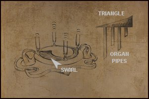 | You can now work out a correlation between the organ pipes and the tuning forks. The longest organ pipe (below the narrowest part of the triangle) and the tuning fork at the narrowest part of the swirl (marked with four lines) are associated. Similarly, the shortest organ pipe and the tuning fork with one line above it are at the widest parts of the triangle and swirl. Apply the same logic to the second longest and second shortest organ pipes to associate them with the tuning forks marked with three and two lines respectively. |