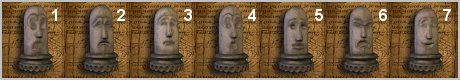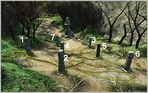 | Did you notice the green vine intertwined between the seven stone posts? It seems to start at the leftmost post (facing away from the deity) and links the posts in a specific sequence. Trace the route followed by the vine and place the mood figures on the posts in the same order as they appeared in the water. |