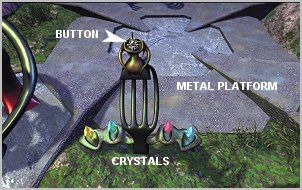 | After inserting all the Crystals press the button at the top. A teleportation bubble forms around the metal platform in front of you. Finally a way to get rid of those pesky women! Click the gong again and as soon as the women appear press the teleportation button. Although this is a timed sequence, you have more than enough time to do it in. |