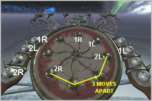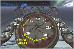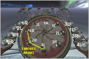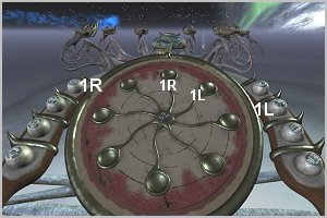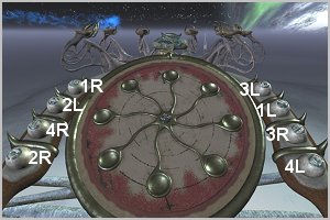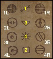 | The diagram in your Journal divides the symbols into four pairs. Each pair is separated by a lift indicator symbol. The planet symbols are numbered in white by pair number (1-4) followed by an L or R to indicate the Left or Right symbol. The lift symbols are in yellow and indicate how far apart from one another each pair must be placed. | ||||||||||||||||