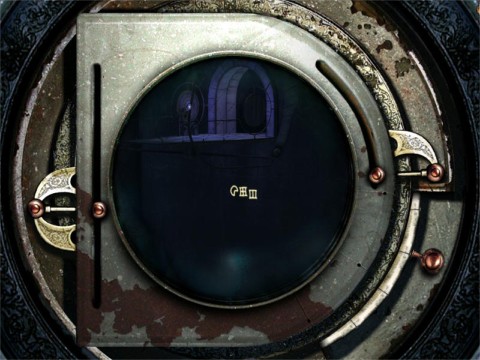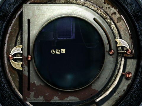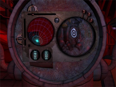 Notice the huge pillar you see through the scope right now. Zoom in carefully to see some kind of entrance. Move the scope a little to the left. Zoom in further to see some kind of signs beneath the entrance. Zoom in further until you can clearly see the signs to find out it is a set of coordinates that you saw earlier in the control room. Now you might think: hey... but the control panels have only two digits for coordinates and this one has three digits. That's correct but the first digit is to show the proper control panel. Study the control panels and look closely to the planet on the left topside to see what I mean. Exit the telescope.