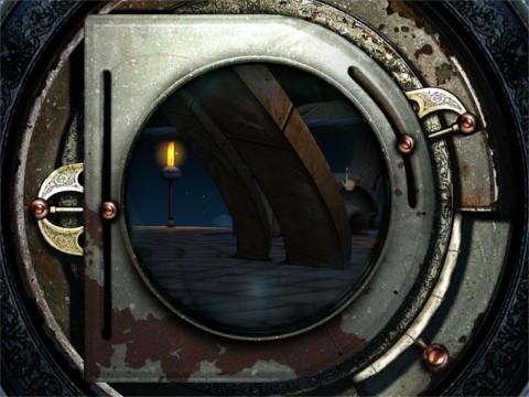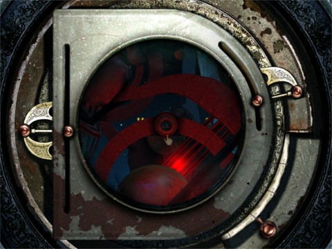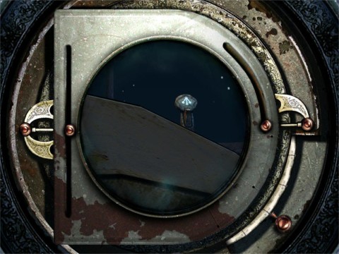 Exit the control room and climb up the stairs at your left side. Walk all the way up. When you reach the upper platform turn to the right. Walk to the huge telescope. Look through the telescope. Note that this telescope has three sliders. With the slider to the left you can move the telescope up and down. With the right top slider you can zoom in and zoom out. The right bottom slider is to move the telescope horizontally.