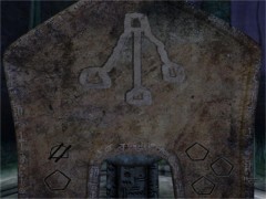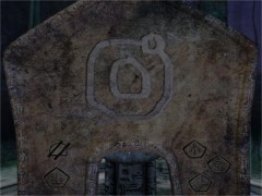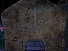Turn to the right and climb up the next stairs. At the top of the stairs, go to the right, toward the closed door. Turn to the right. Press the blue-lit button to open the door. Turn to the left. Climb up the next stairs and notice a Bahro sign on the wall. Make a note of this sign! Open the door by pressing the blue button and go outside to have another meeting with Esher. Walk to the pedestal and take the Slate. Enter the building that you have just left. Go all the way down and step outside. Use the Slate to make a drawing of the Bahro sign you just saw on the wall. Drop the Slate on the floor.