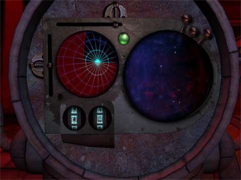 Turn to the left and walk to the front of the controls. Walk to the left side of the controls. Turn to the right and set the first control to the correct coordinates and press the green button. Notice on the little screen that another telescope will be set too. Turn to the right and head back to the linking bubble.