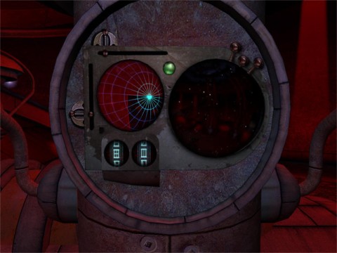 Enter the control room and climb up the red-lit stairs. Go to the right side of the controls and walk to the end. Turn to the left to see a control panel that is out of order. Move the left slider to the upper position and move the upper slider to the most right position. Press the green button. If you like you can look at the other control panel on this side. After that walk to the left side of the controls to see two other control panels. So in total there are four control panels of which one is out of use.